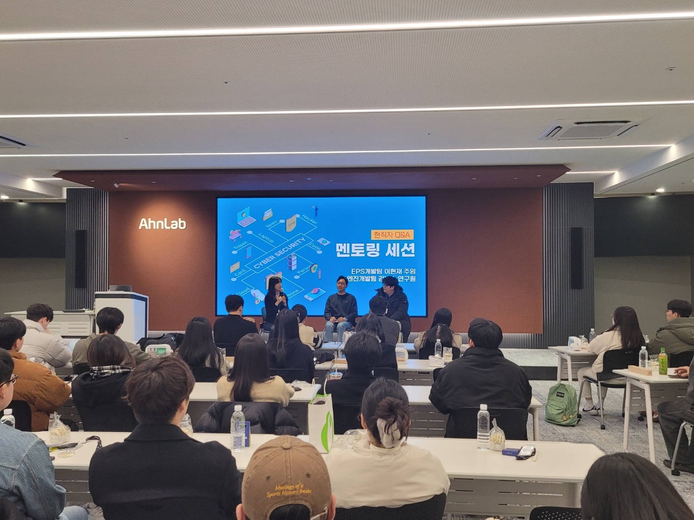 안랩에 입사하고자 하는 의지를 불태우며 교육생들이 집중해서 멘토님의 말씀을 듣고 있는 모습을 보여주었습니다. 지금의 순간이 훗날 안랩 취업을 준비하는 동안 도움이 되기를 바랍니다.