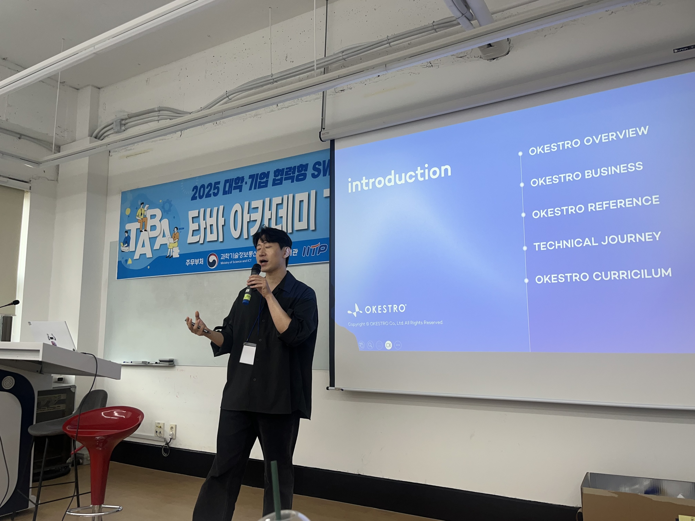 축사 이후에는 단국대 조성제 교수님께서 교육과정 안내를 진행해주셨고, 다음으로 오케스트로 최우성 매니저님께서 오케스트로에 대한 기업소개를 해주셨습니다.
