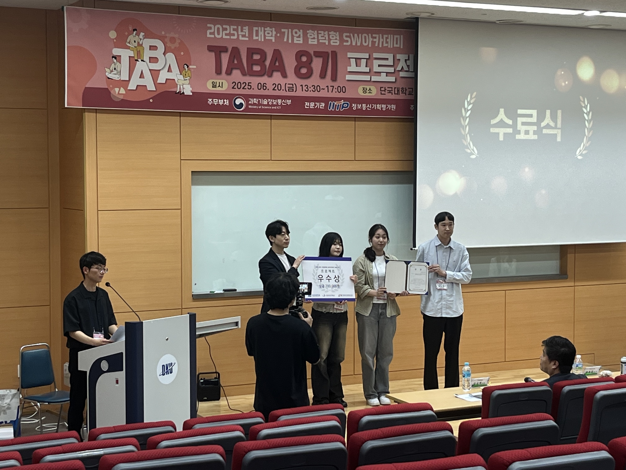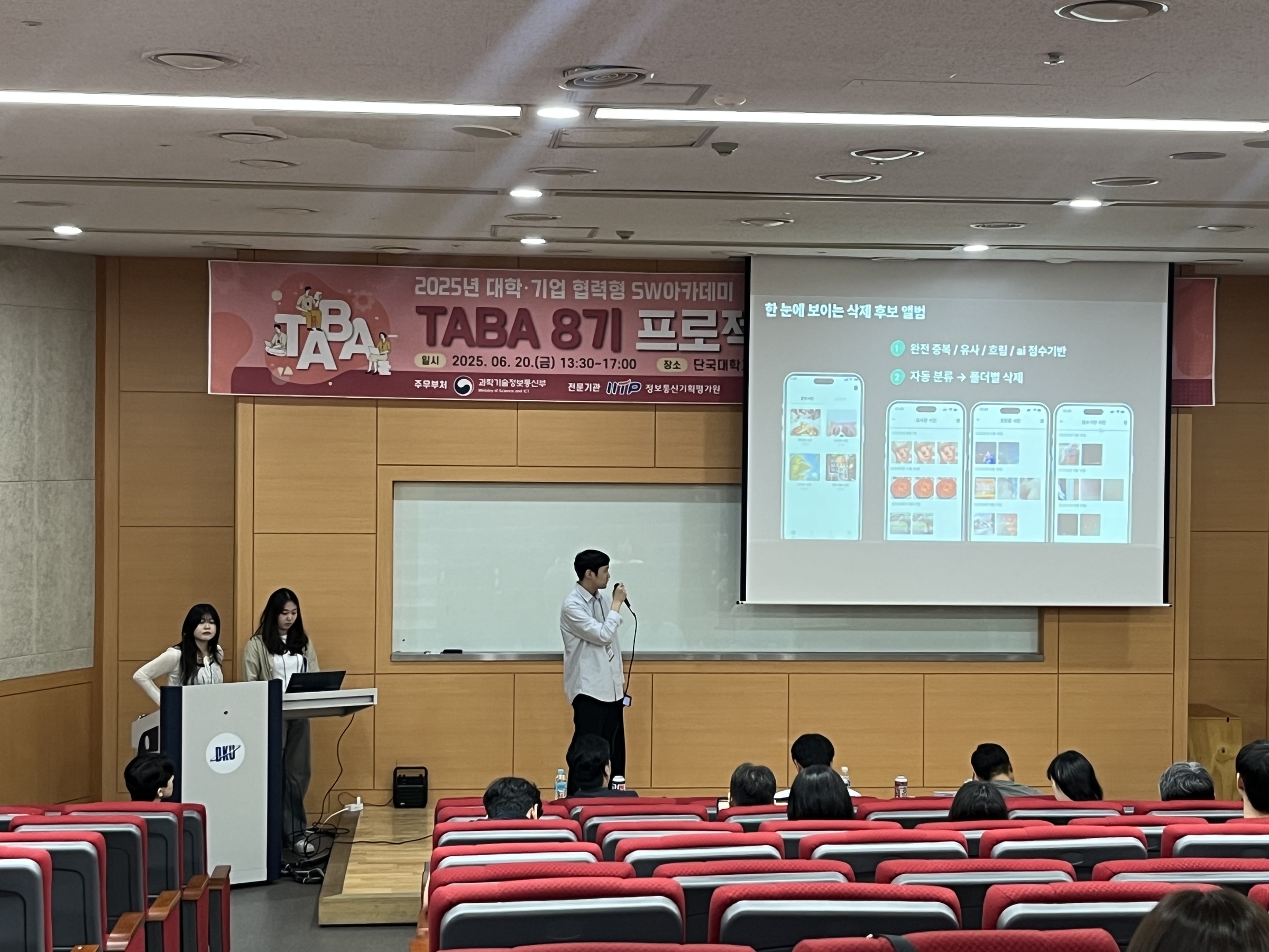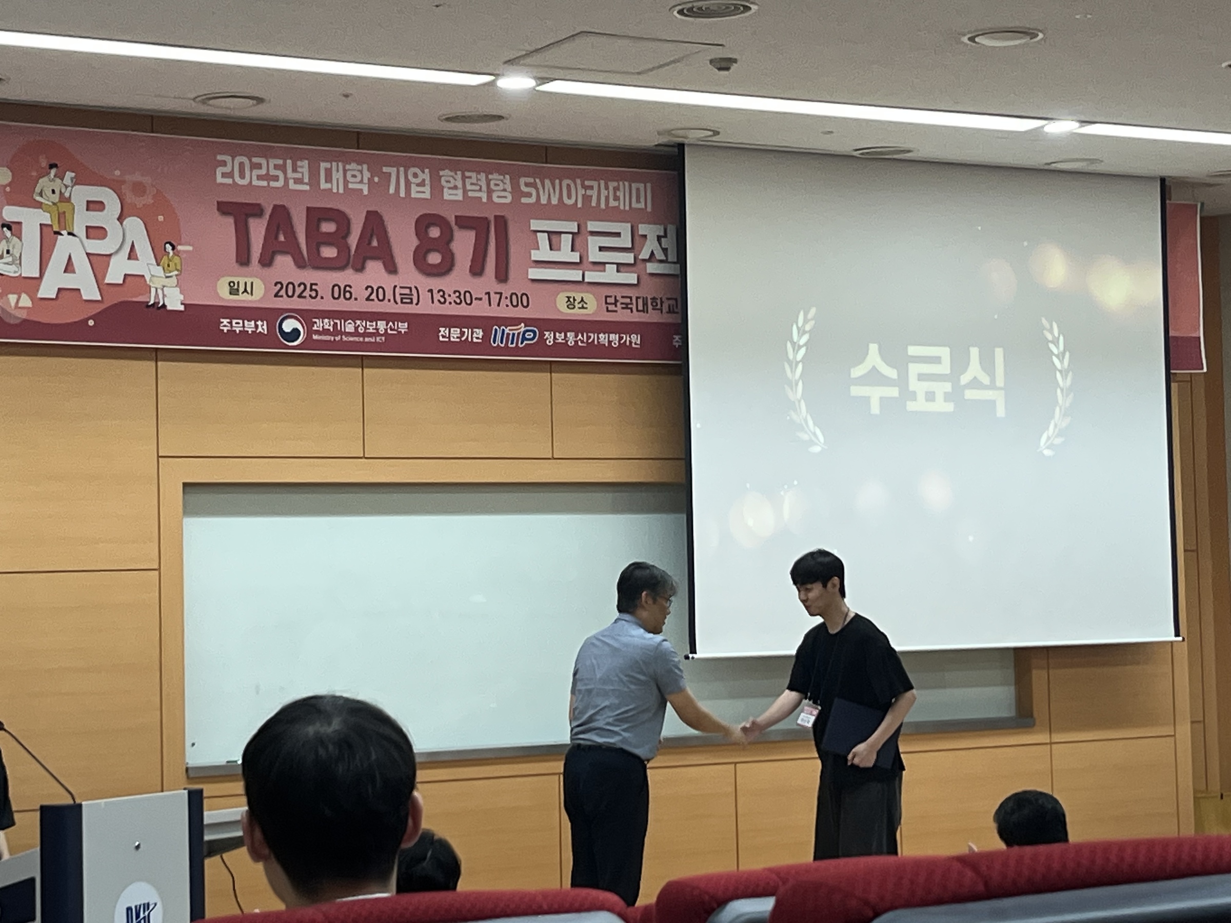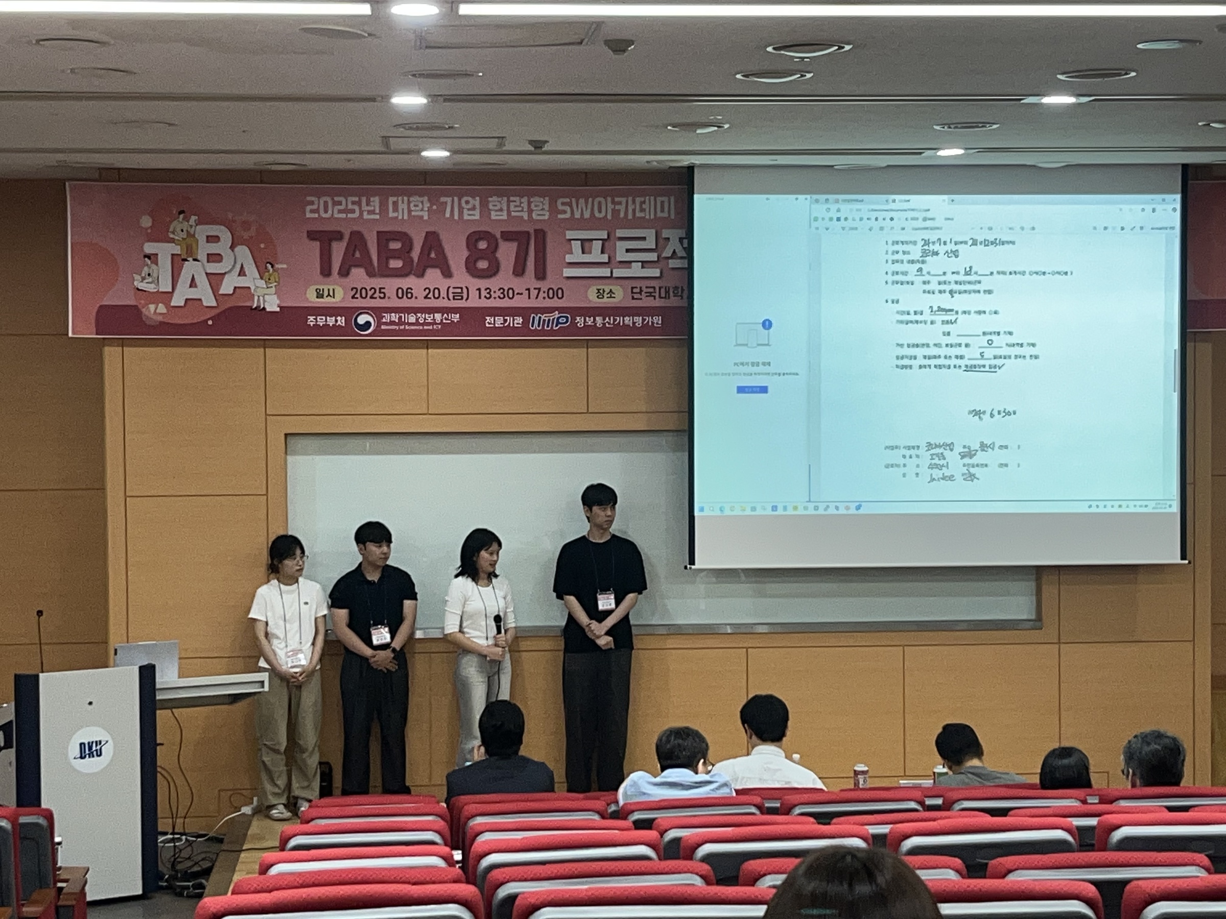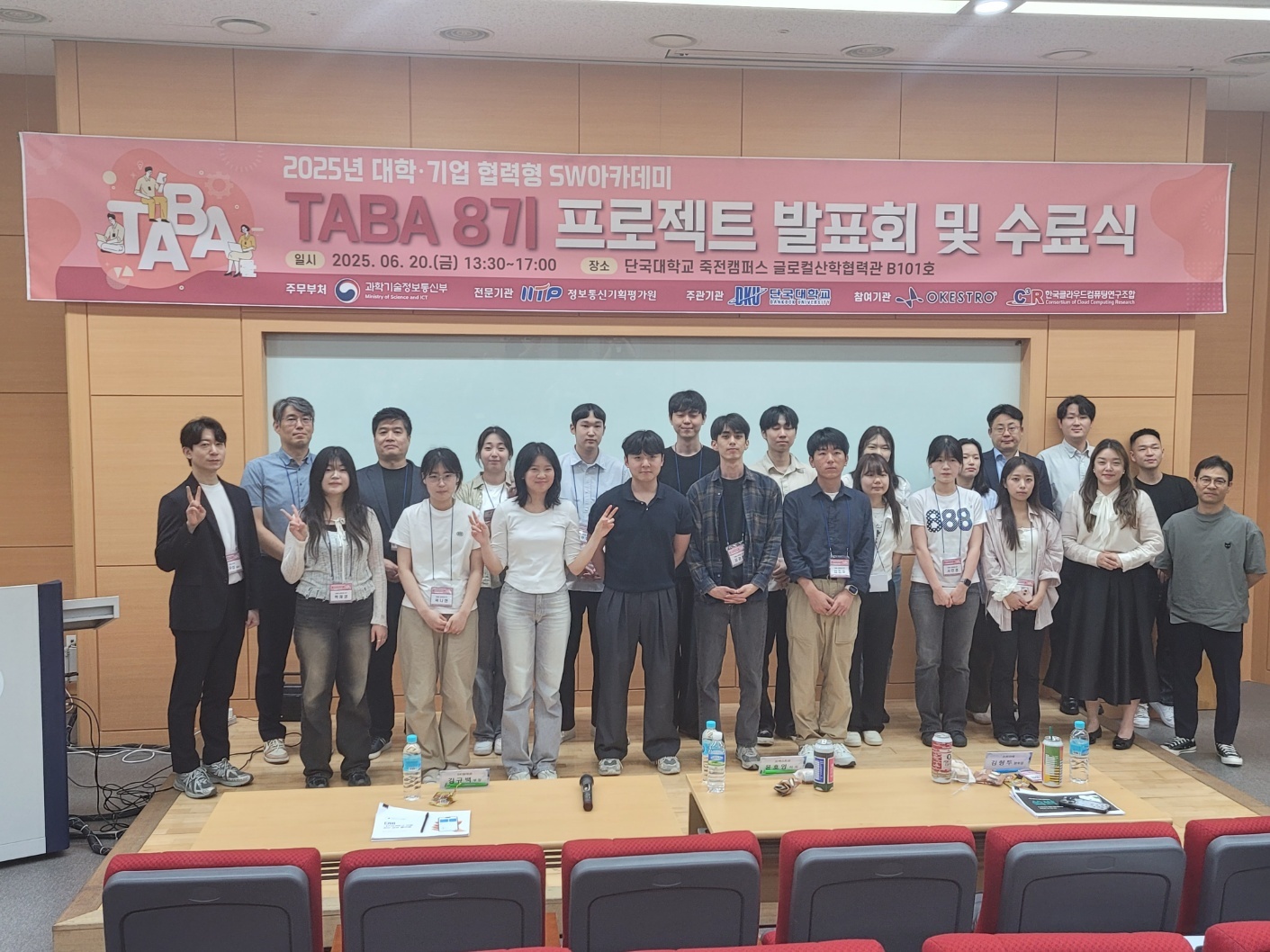 지난 6월 20일 금요일, 단국대학교 글로컬산학협력관 B101호에서 2025년 대학·기업 협력형 SW아카데미 TABA 8기 프로젝트 발표회 및 수료식이 진행되었습니다.